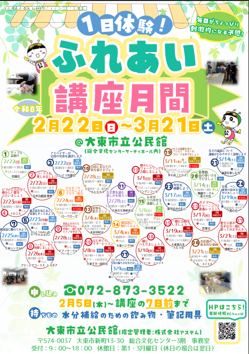1日体験ふれあい講座月間 2026年1月20日 最終更新日時 : 2026年1月15日 竹浪桃子 日時::2026年2月22日(日)~3月21日(土) 場所:大東市立公民館 サーティホール(大東市新町13-30) 申込み:電話2月5日~講座の7日前まで 申込み・お問合せ:サーティホール ☎072-873-0030