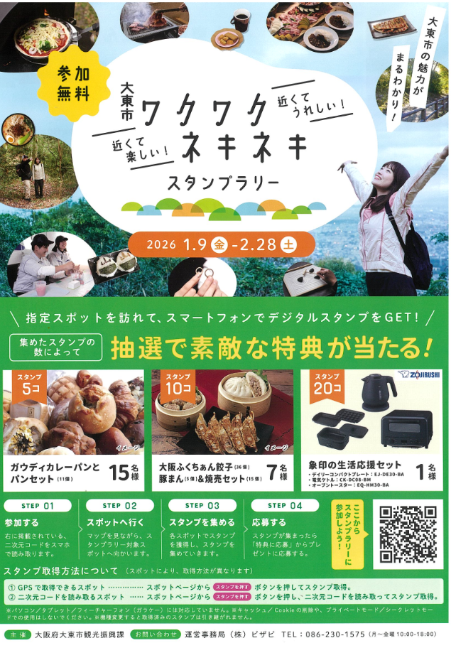 スマホでQRコードやGPSを読み取るだけでスタンプを獲得でき、集めた数に応じて大東市ならではの地元グルメや象印の生活応援セットなどが当たります。