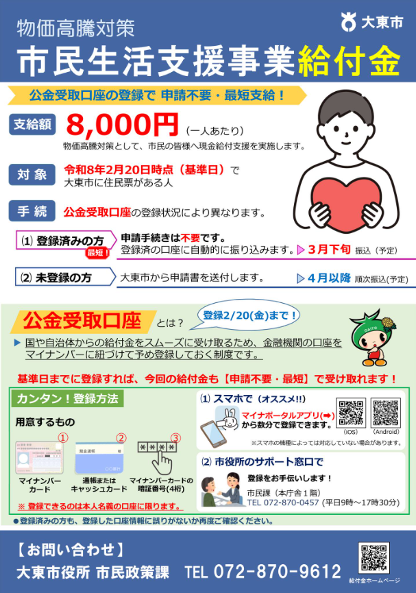 市民生活支援事業給付金 2026年2月22日 最終更新日時 : 2026年2月19日 竹浪桃子 エネルギー・食品価格等の物価高騰の影響を受けた全市民に対し、地方公共団体が地域の実情に合わせて必要な支援をきめ細やかに実施するための「物価高騰対応重点支援地方創生臨時交付金」を活用し、1人あたり8,000円の現金給付を行います。